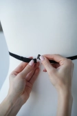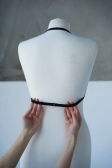Мінімалістичний бра з еластичних стрепів у чорному кольорі. Модель без чашок і без кісточок, створена для декоративного акценту в образі або як самостійний елемент білизни.Конструкція формує чітку геометрію ліній, підкреслює зону декольте та плечі, а бретелі дозволяють адаптувати посадку під індивідуальні параметри.